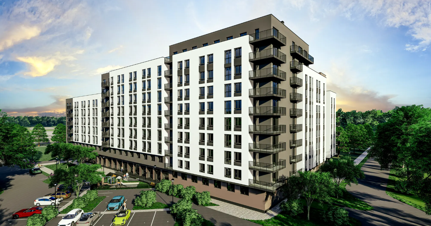 Прибудинкова територія буде озеленена, облаштована місцями для відпочинку. Для автомобілів мешканців проєктом передбачений підземний паркінг на 46 паркомісць та гостьова стоянка.