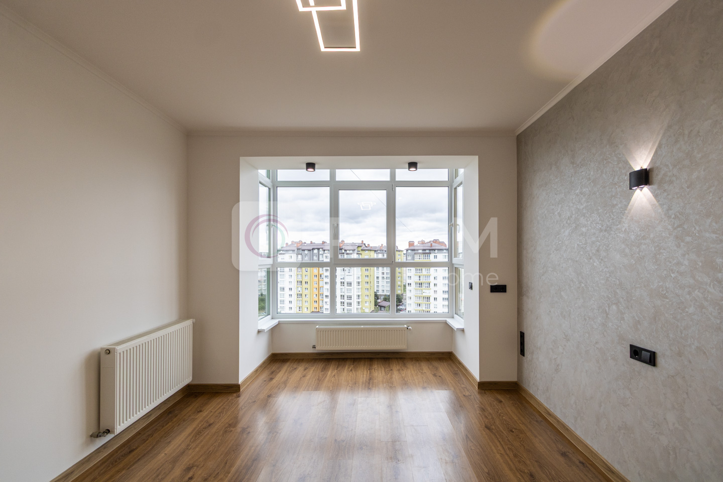 Продумане планування: простора спальня з панорамними вікнами, кухня з виходом на лоджію, гардеробна, санвузол та прихожа.