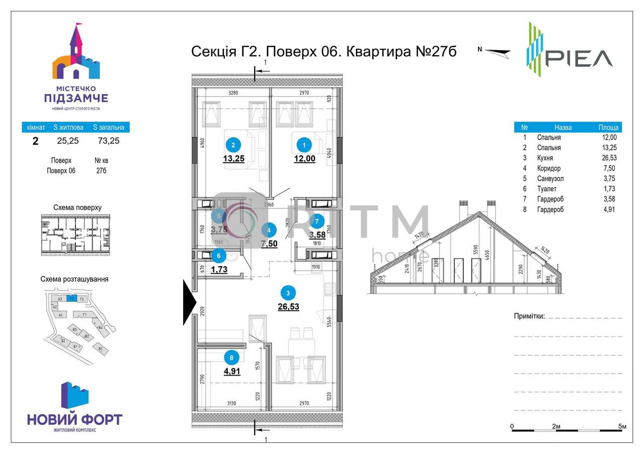Площа: 73,25 м²