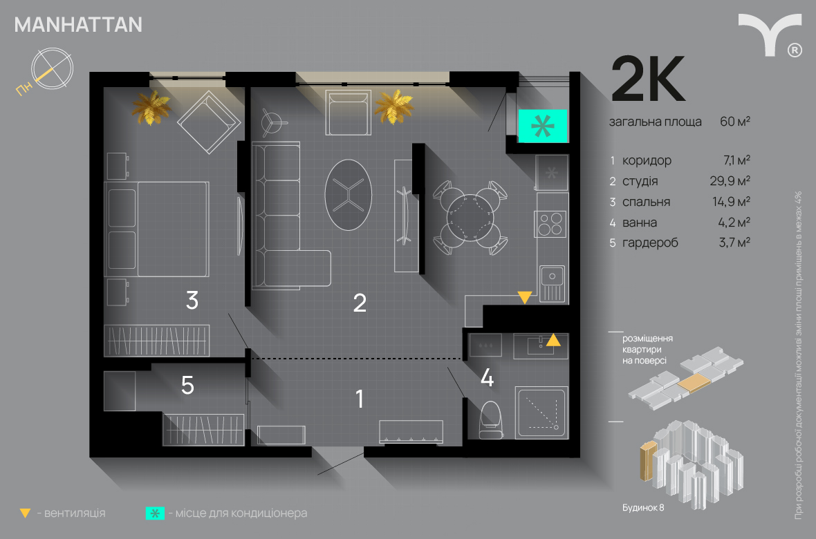 Пропонується стильна 2-кімнатна квартира в престижному ЖК Manhattan.Квартира розташована на зручному 4 поверсі,що забезпечує комфорт та гарний огляд з вікон.