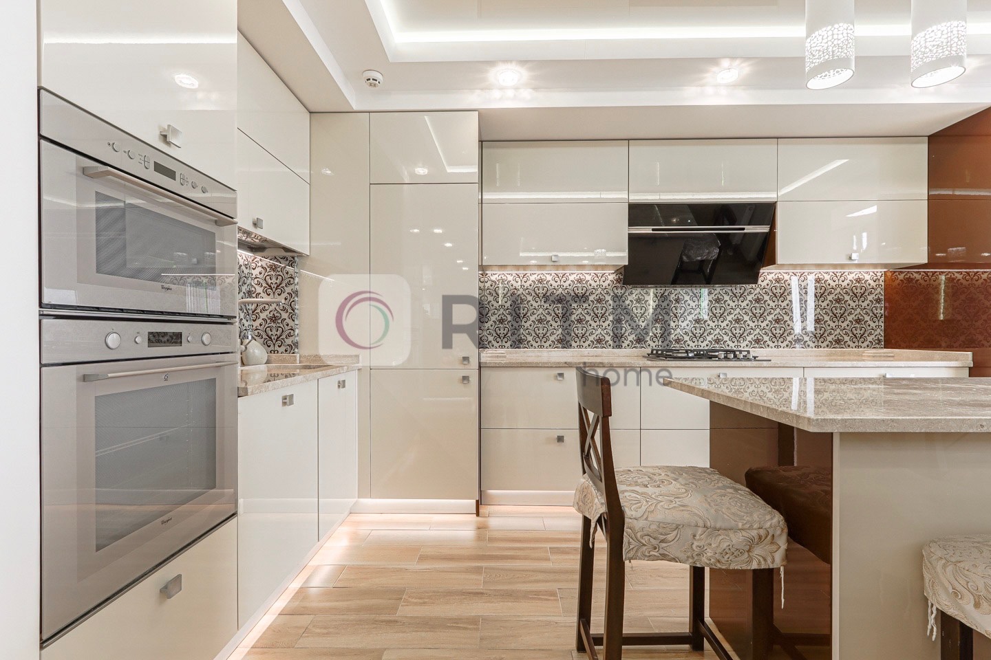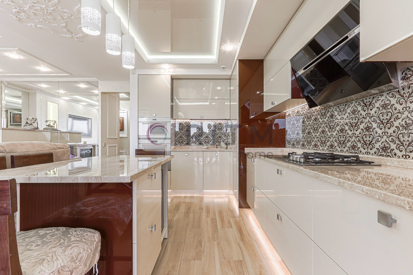 Стильний простір із використанням італійського мармуру (робочі поверхні, барна стійка, камін) та преміальної техніки: газова плита, духова шафа, мікрохвильова піч, посудомийна машина, винний холодильник, кавоварка, пароварка, подрібнювач їжі, система очистки води, кондиціонер.