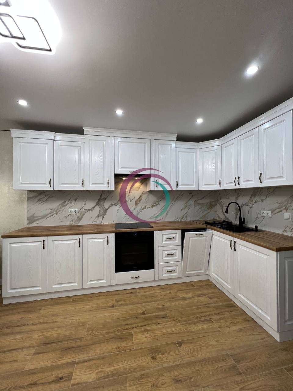 Простора кухня-студія з великою шафою та зручним зонуванням