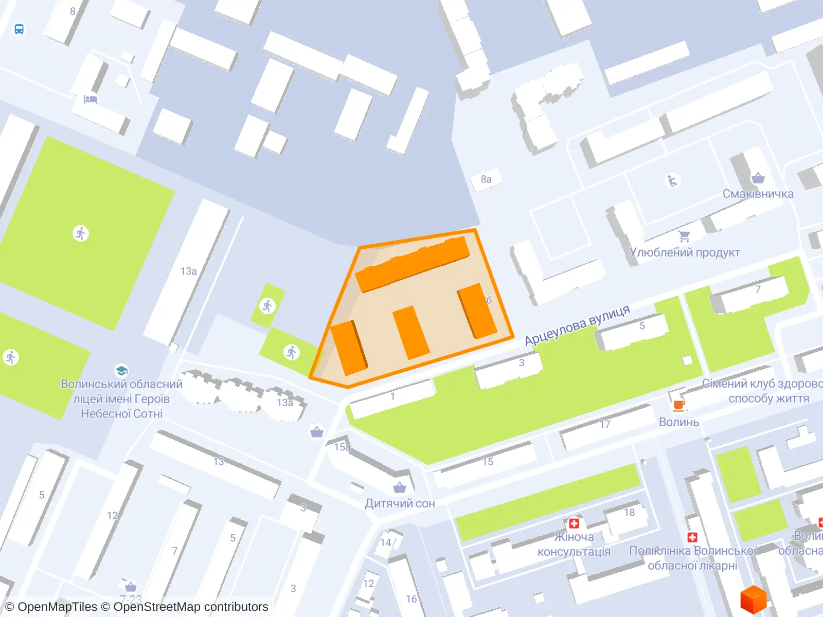 Недалеко від будинку амбулаторія сімейної медицини, дитяча поліклініка, обласна лікарня та пологовий будинок.