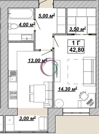 Площа 42,8 м², 13/14 поверх.