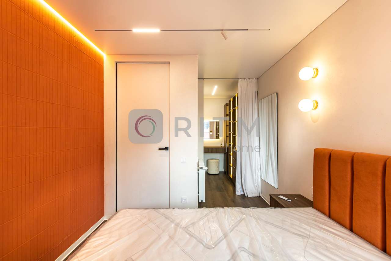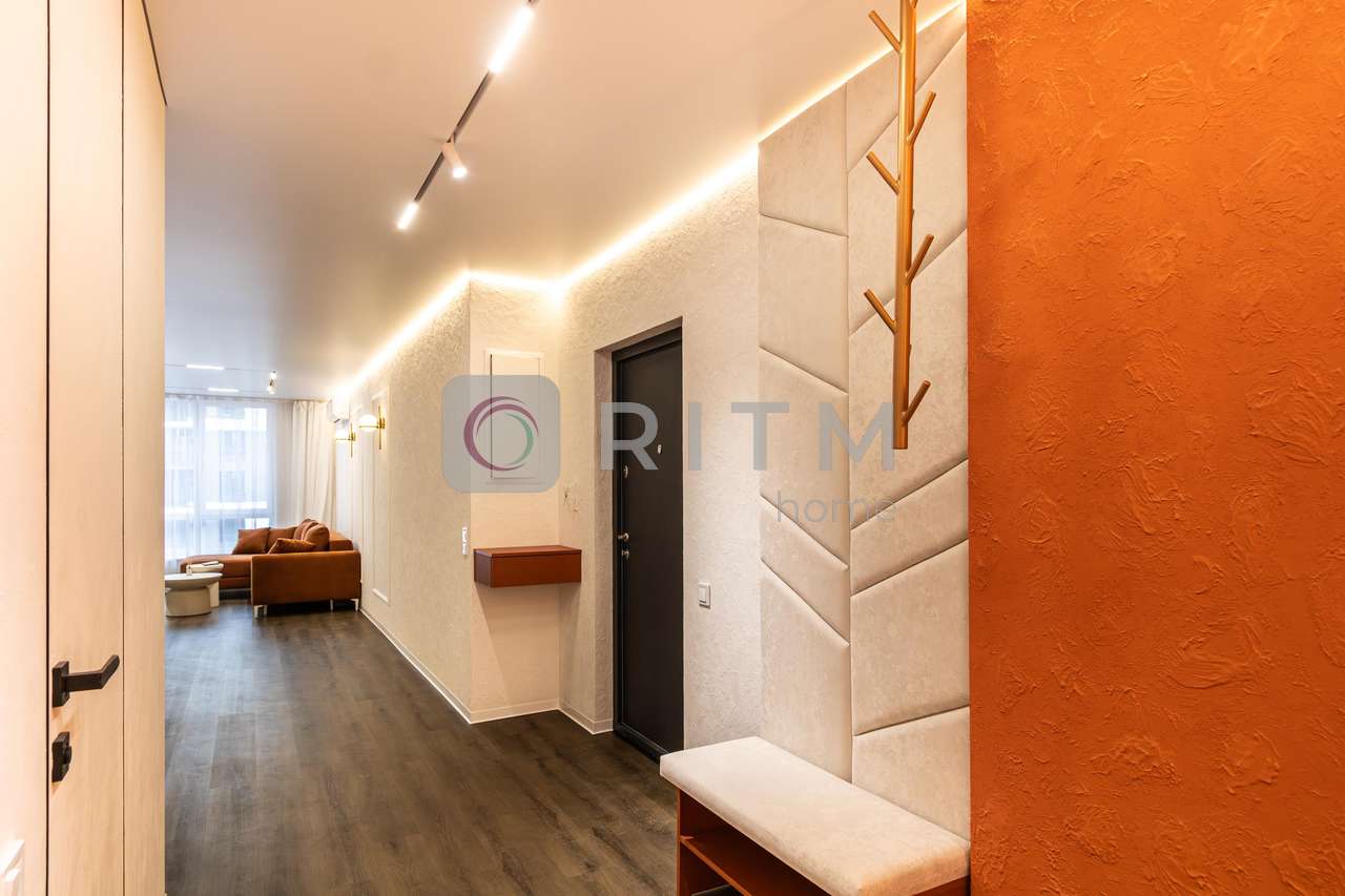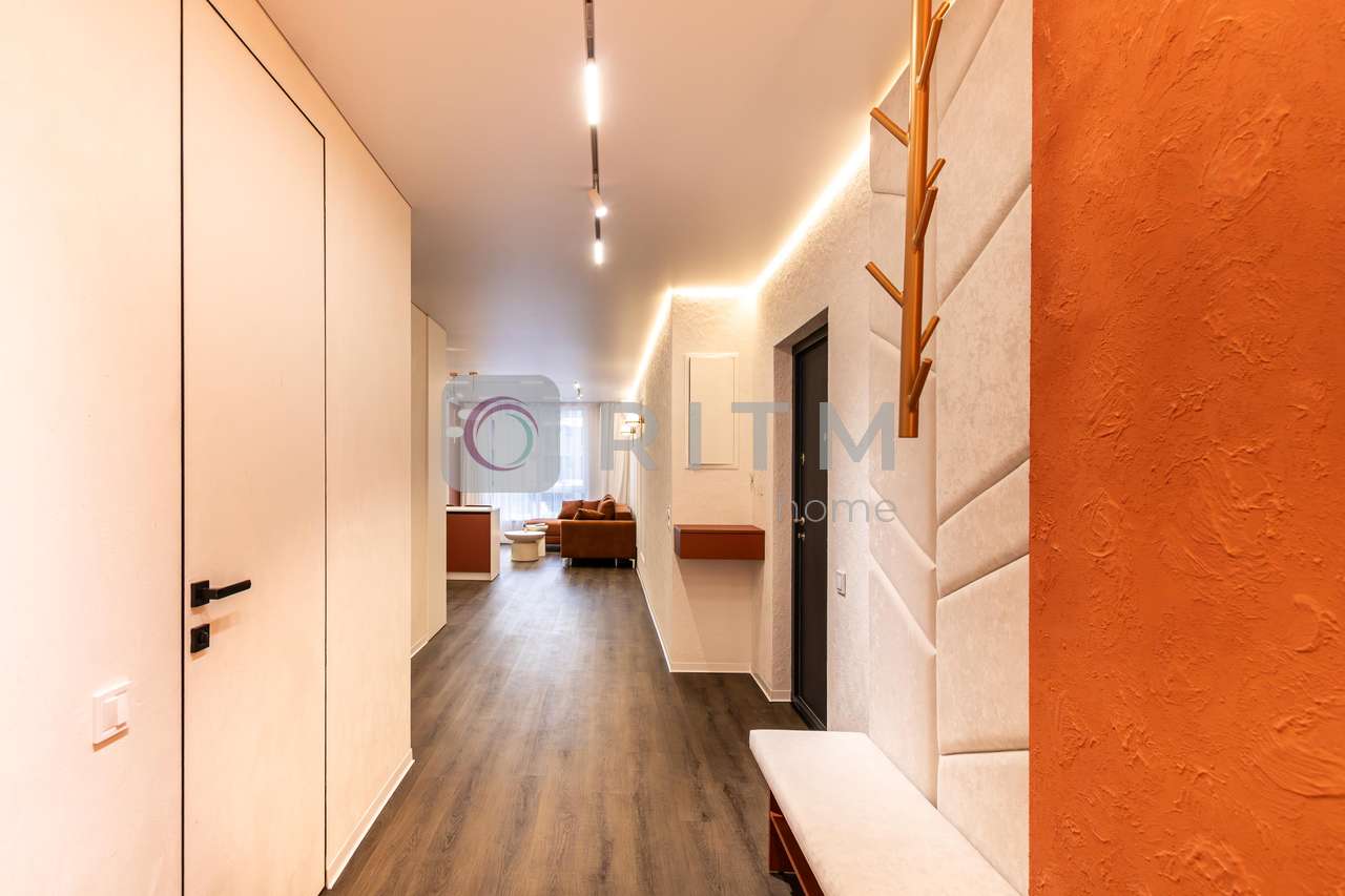 Родзинка квартири — унікальний помаранчевий стиль, який підкреслює сучасність інтер’єру та створює особливу атмосферу для любителів нестандартних дизайнерських рішень.