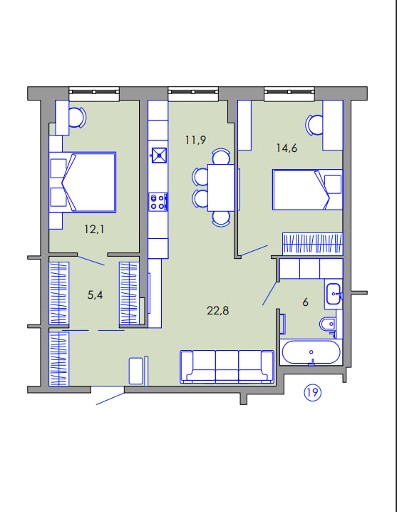 Планування: дві окремі спальні + простора кухня-студія