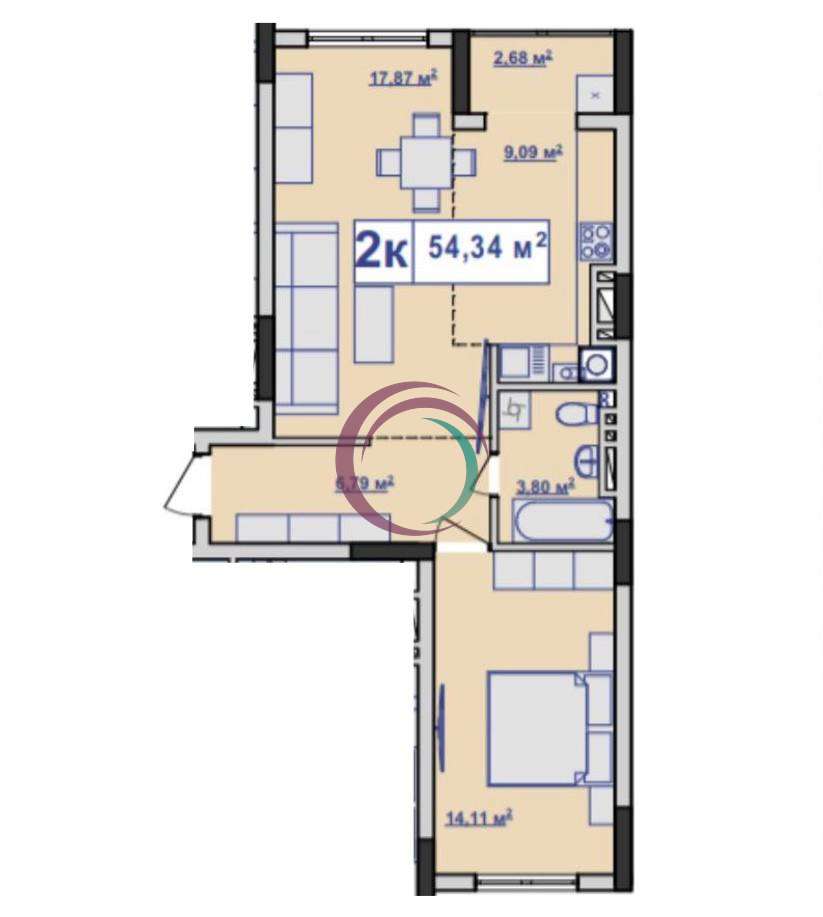 Пропонується до продажу простора двокімнатна квартира площею 54 м² у сучасному житловому комплексі River Stone.