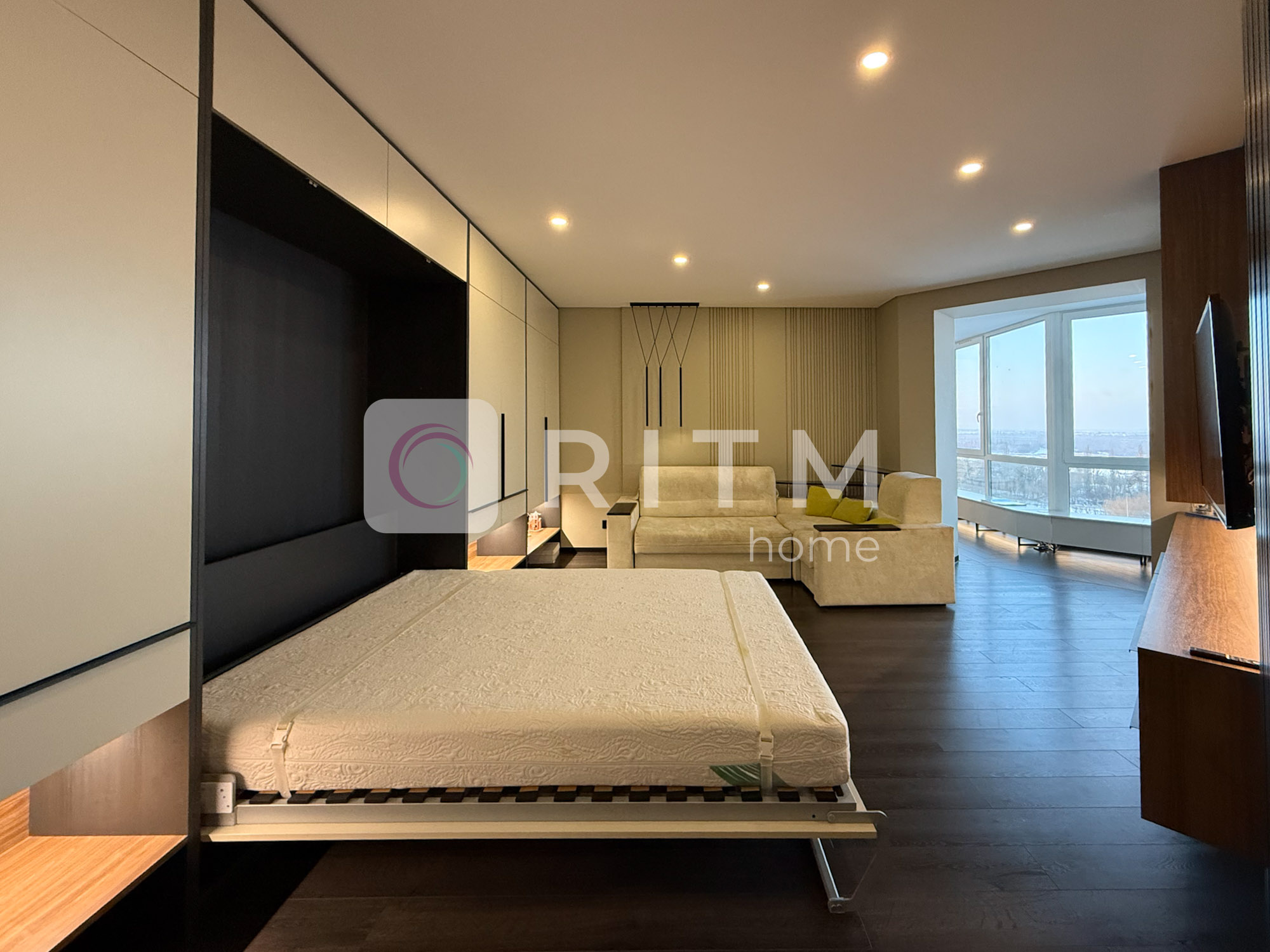 Планування включає велику кухню-їдальню, простору вітальню з розкладним ліжком, дитячу кімнату або гардеробну, а також три зручні кладовки на поверсі з освітленням та розетками — для зберігання речей та обладнання. У квартирі встановлені відеоспостереження, сигналізація та домофон із відеовикликом для безпеки.