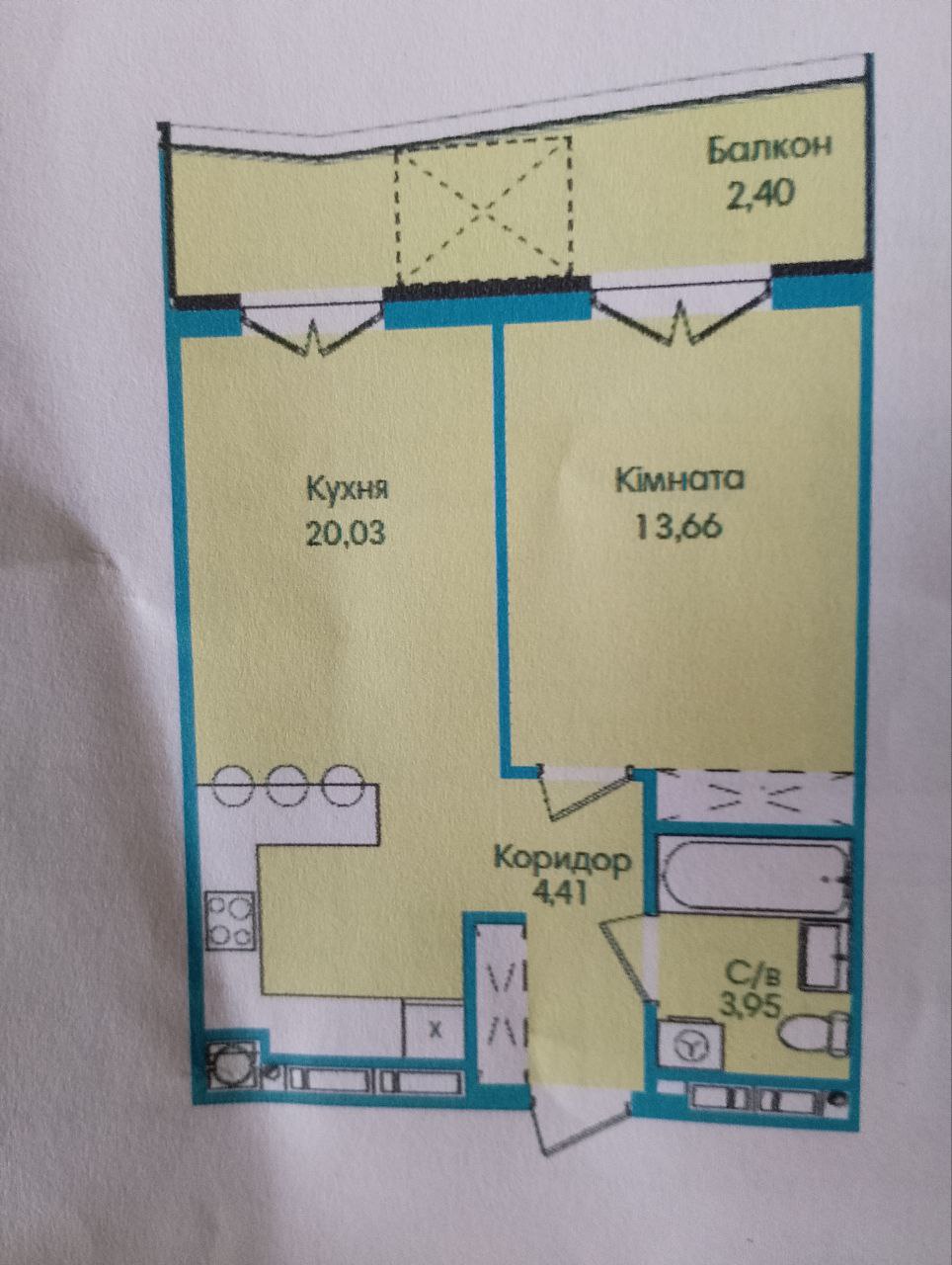 - Зальна площа 44.45м2; кухня-студія 20.03м2;