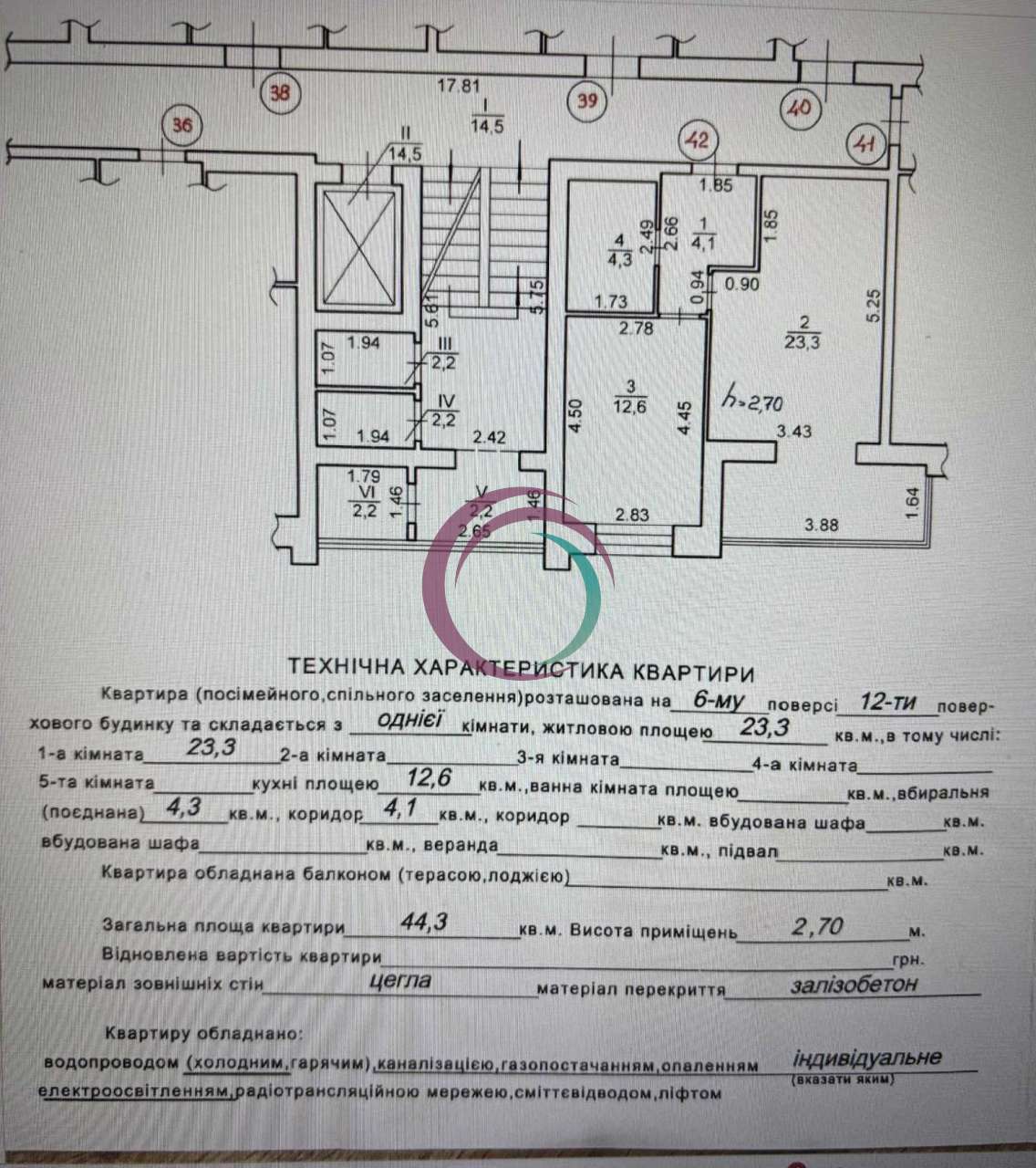 Загальна площа 44,3 м² . Ізольована кімната 23,3 м2, кухня 12,6 м2 .Висота 2,70.