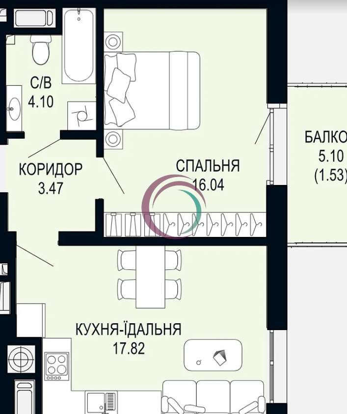-Кухня-студіо 17.82м2, спальня 16.04м2, коридор 3, 47м2, с/в 4, 1м2, великий балкон 5.10м2.