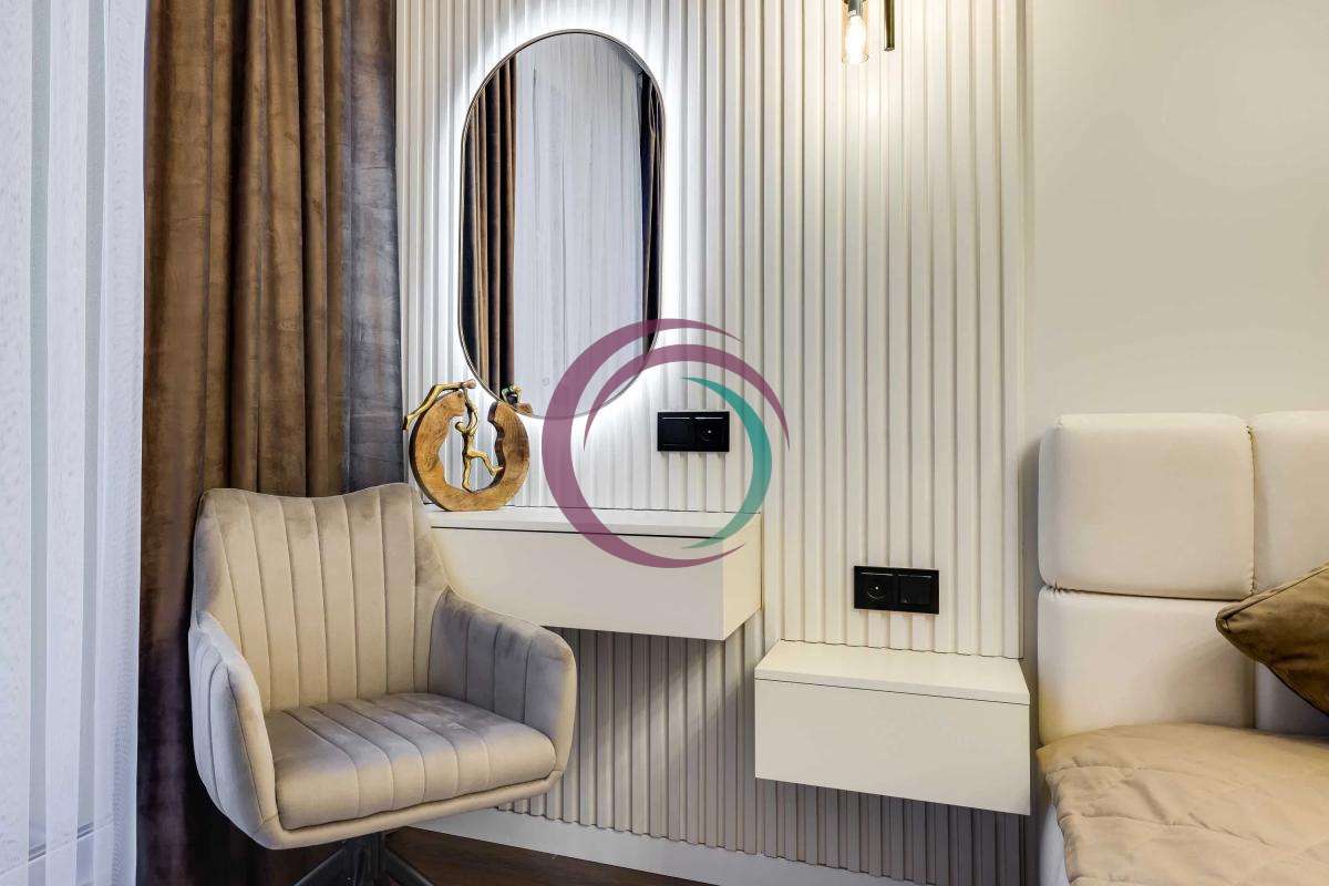 Спальня кімната обмебльована - комфортне двоспальне ліжко, туалетний столик, велика шафа, зона ТВ.