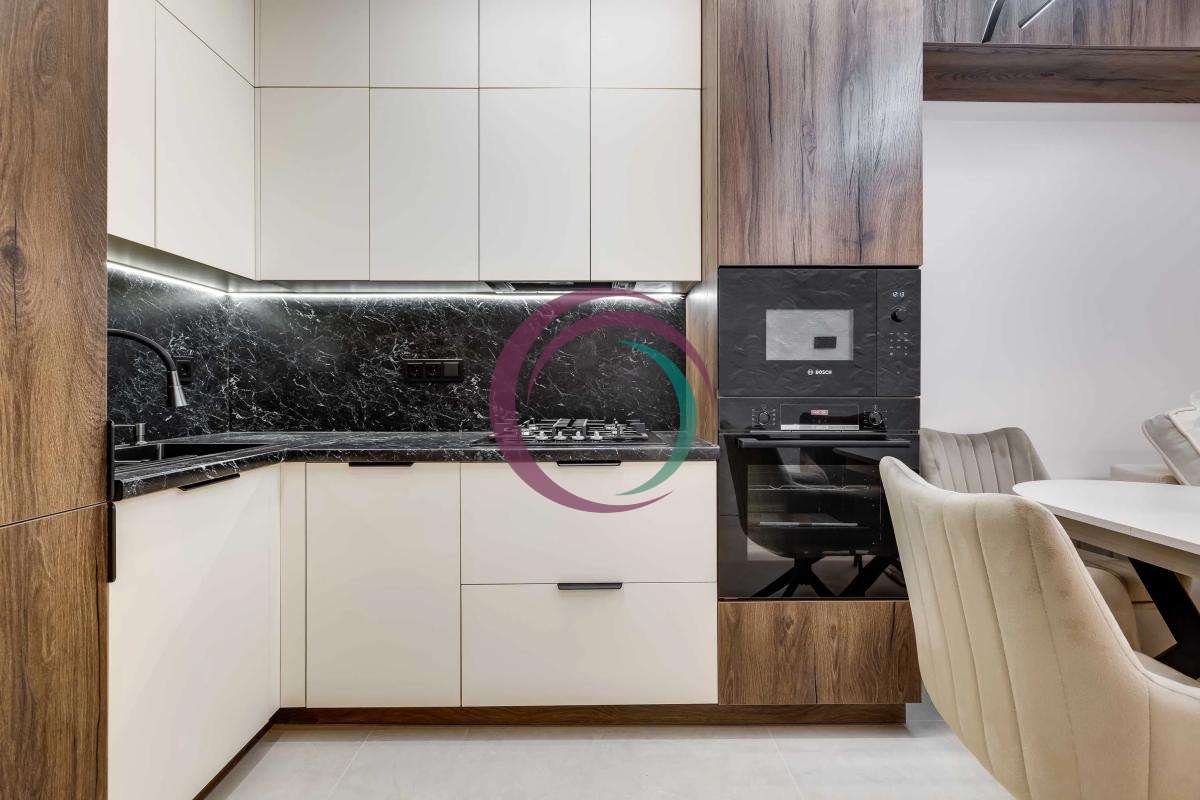 Кухня-студіо з вмонтованою кухнею, побутовою технікою BOSCH, газовим конденсаційним котлом Buderus та відпочинковою зоною із розкладним диваном, столом-трансформером, підігрівом підлоги, виходом на відкритий балкон.