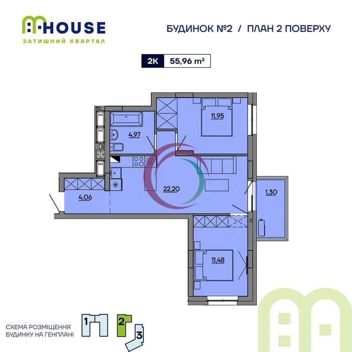 - Загальна площа: 56 м²