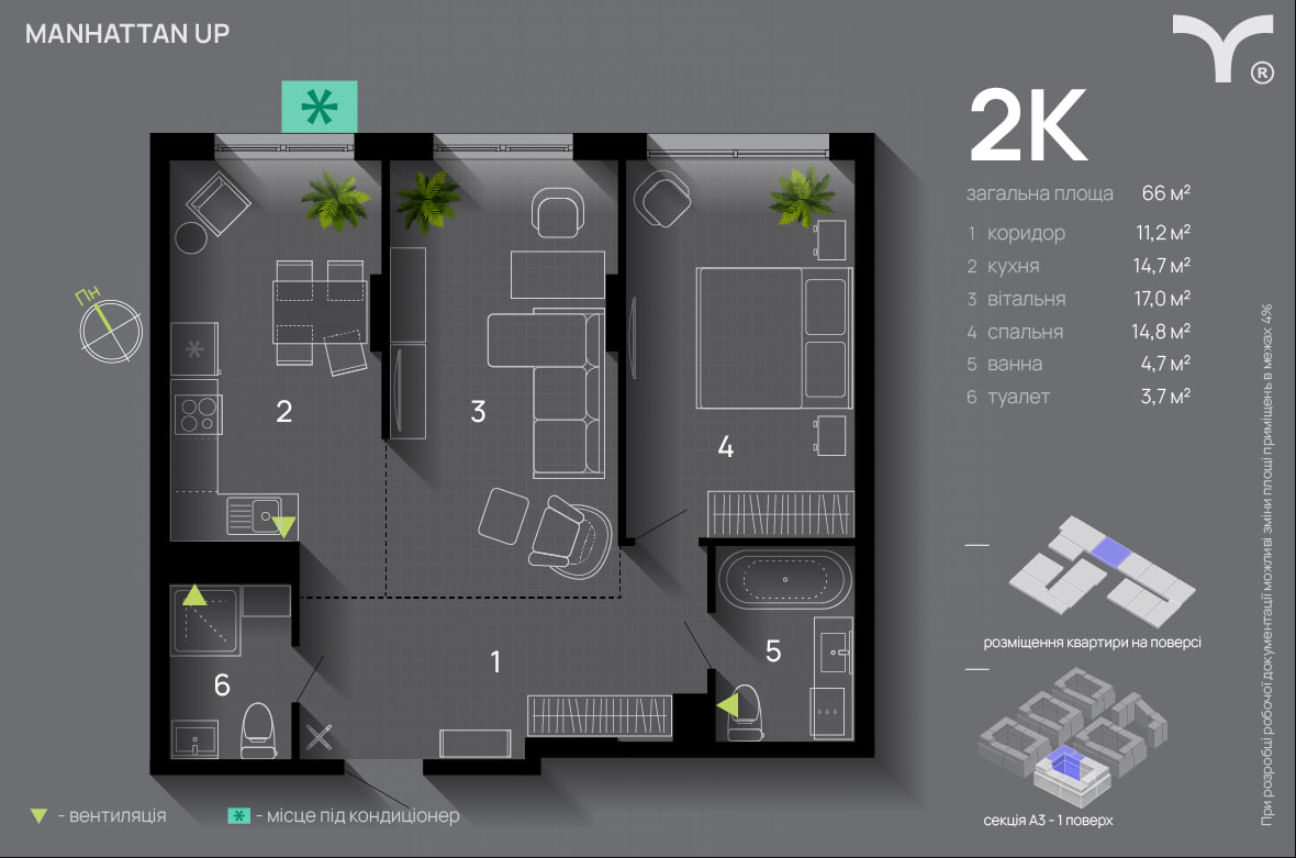 Простора 2-кімнатна квартира 66 м² у сучасному ЖК Manhattan UP
