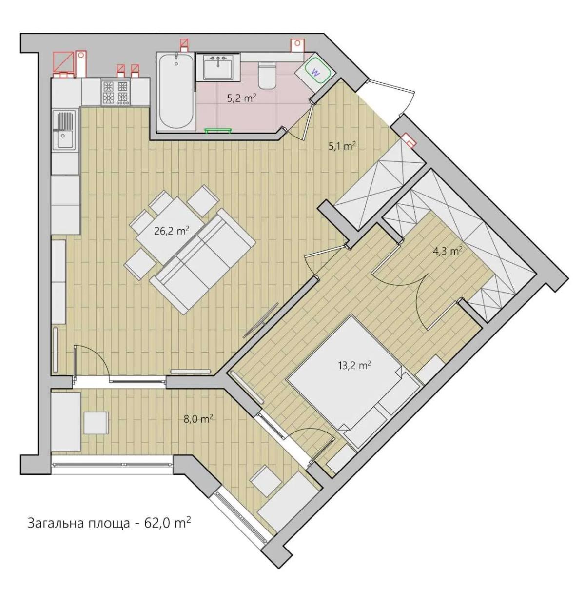 - Зальна площа 62м2; кухня-студія 26м2;
