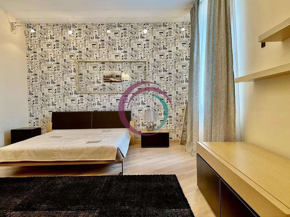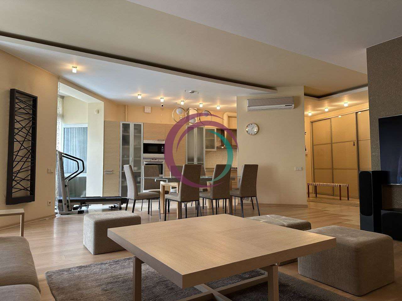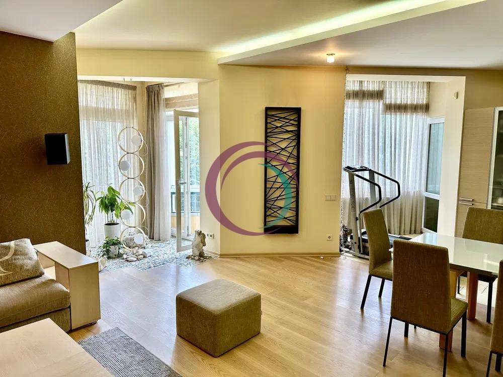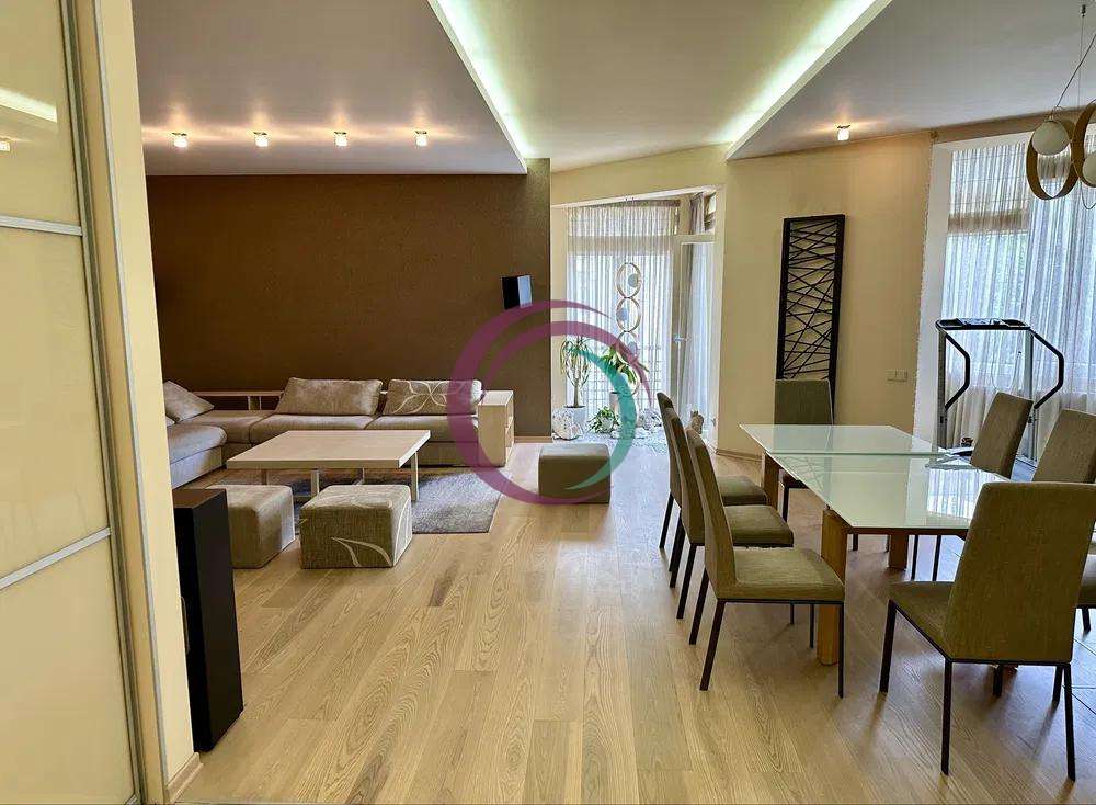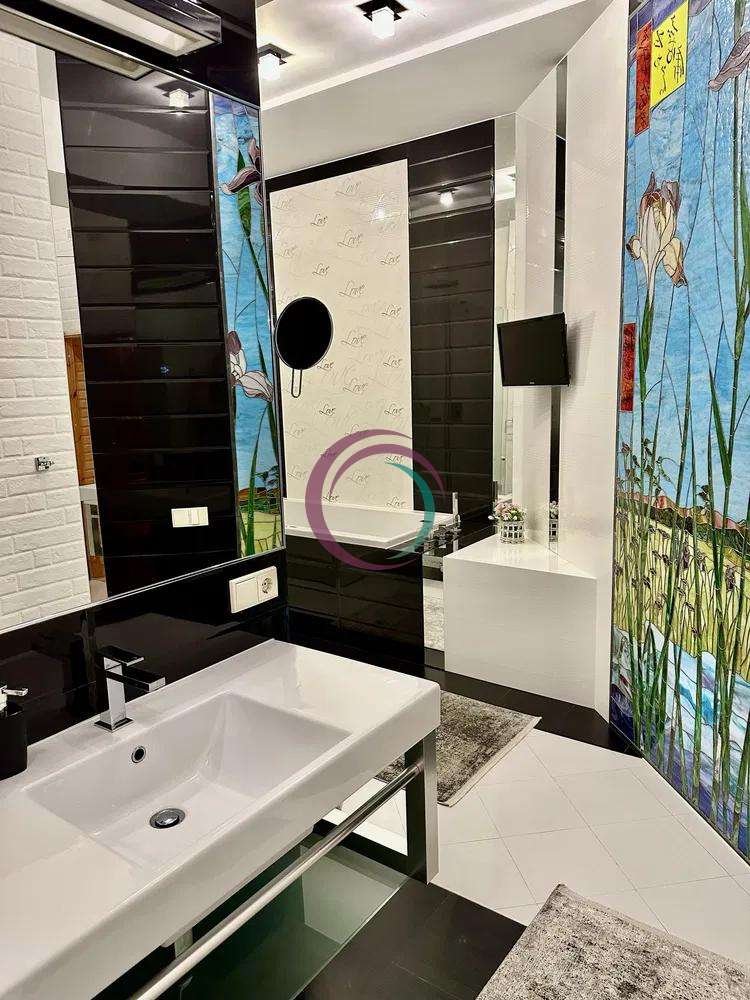 Квартира складається із: кухні-студії (~70 кв. м. ) та трьох кімнат (~22, 28 і 15 кв. м. ) Кожна кімната має свій гардероб, ванна кімната площею 21 кв. м. із сауною. Кухня має дві комори. Одну холодну для продуктів, друга для різних господарських речей. З кухні студії можна вийти на засклений балкон з виглядом у двір будинку. Дизайнерські батареї, підлога натуральна, дорога італійська сантехніка, плитка, італійські меблі. Вся вода, що подається в квартиру проходить через власну систему хім очистки.Квартира облаштована охоронною системою сигналізації. Все що є в квартирі залишається.