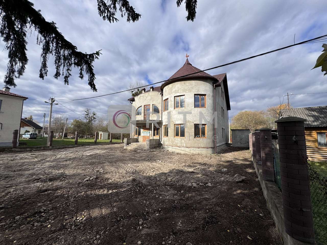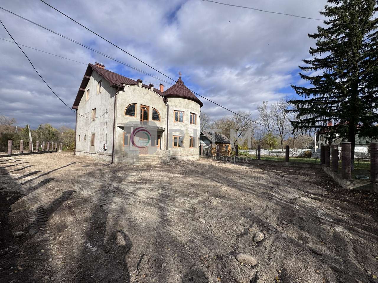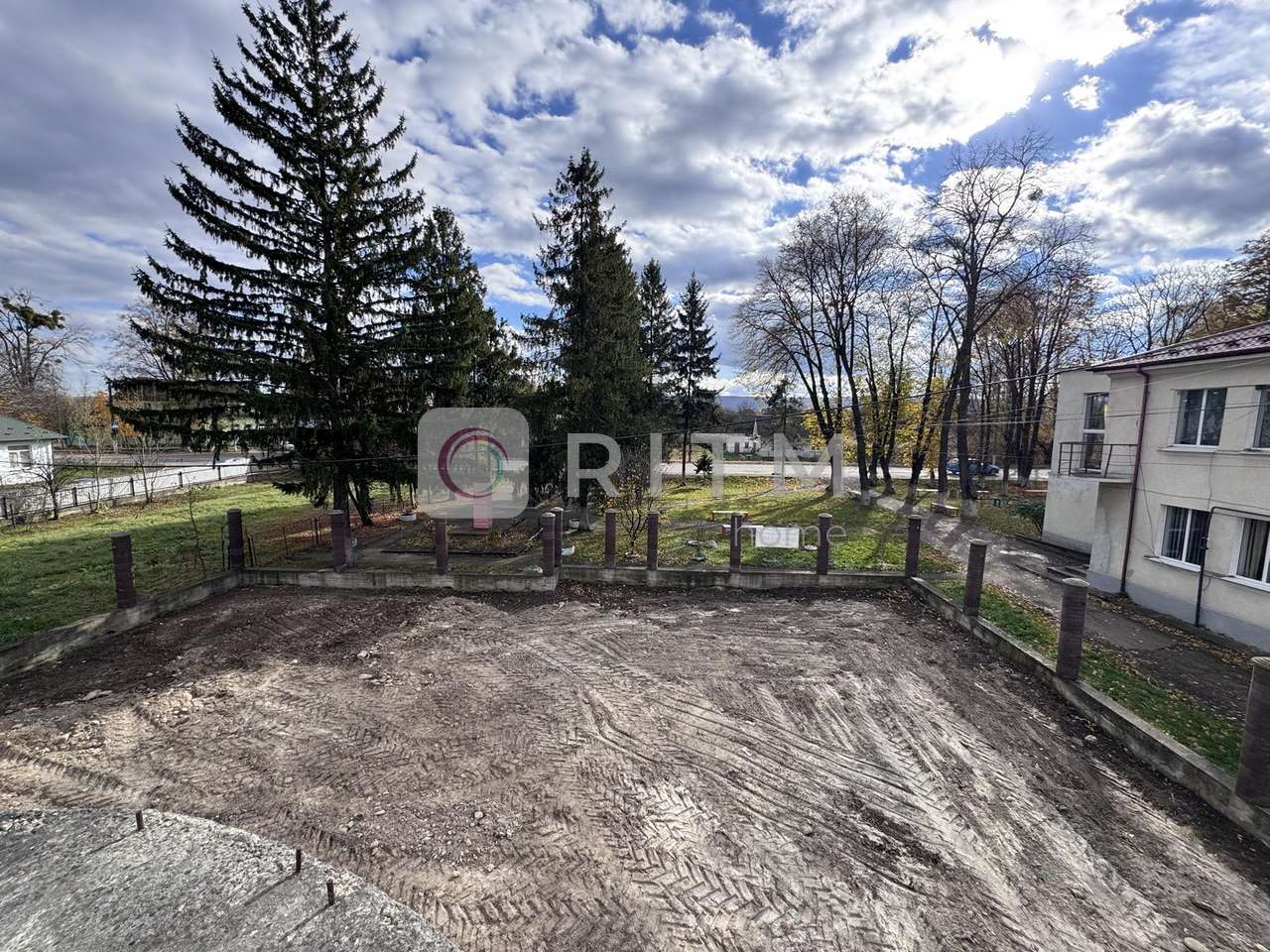 По периметру ділянки залитий фундамент під паркан, змуровані стовпчики. Асфальтований заїзд. На території збудована дровітня.