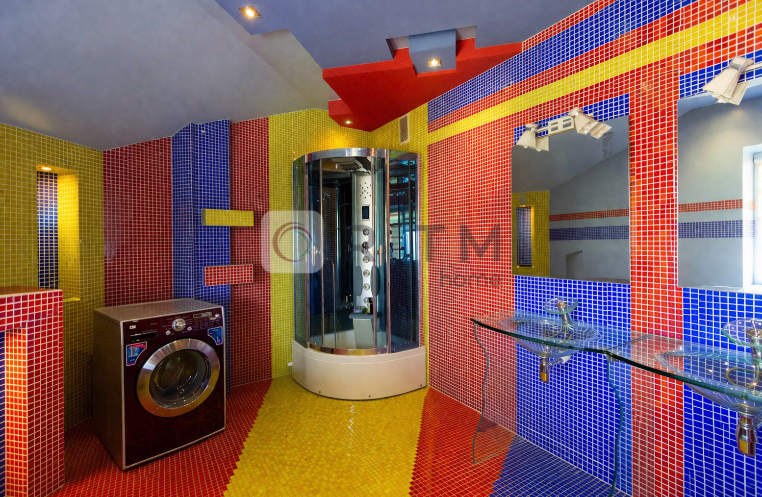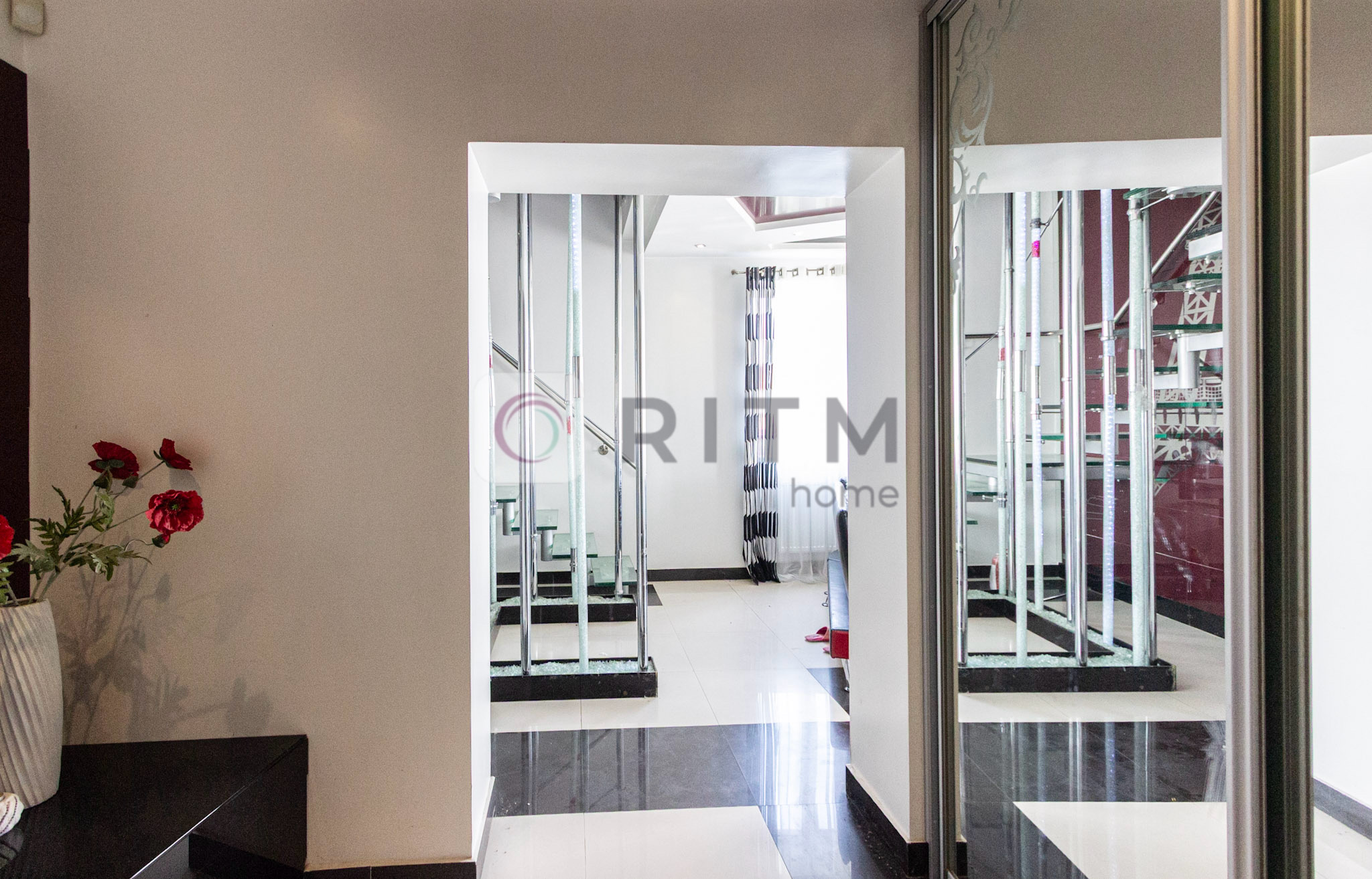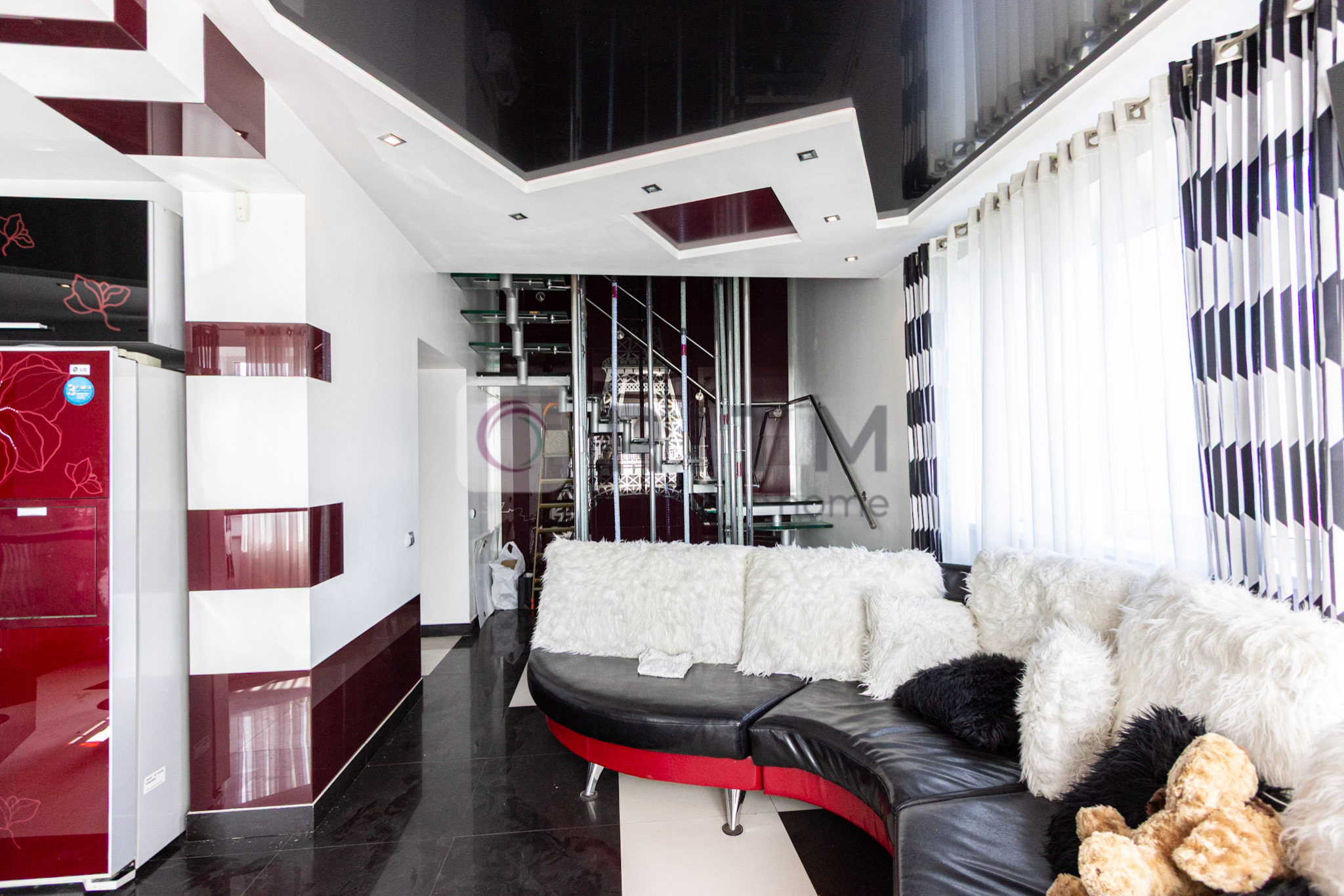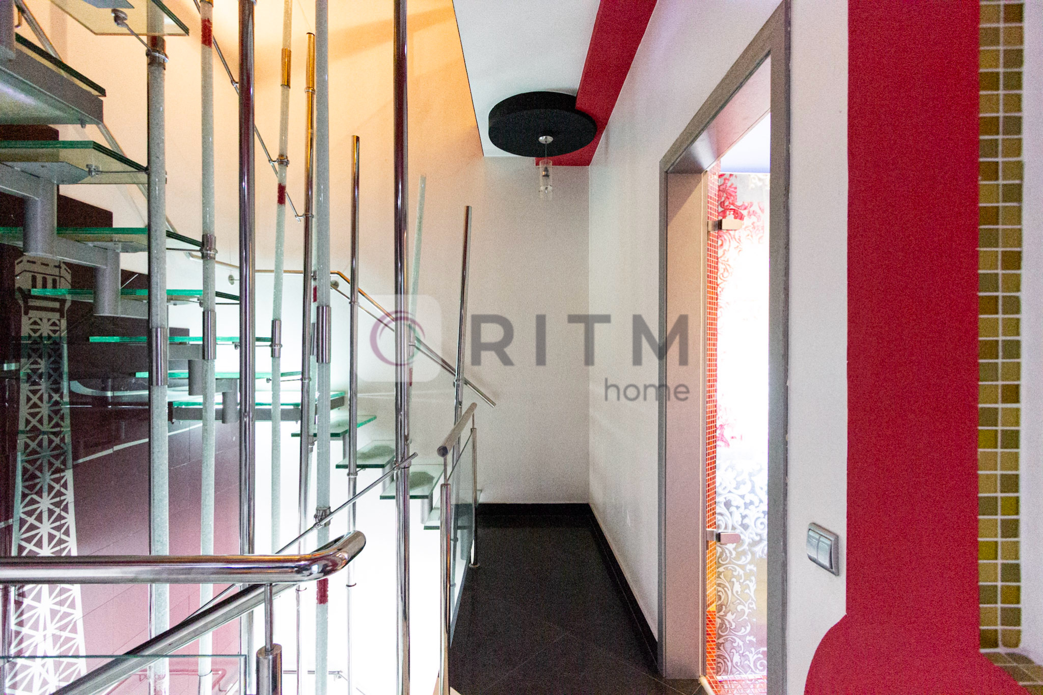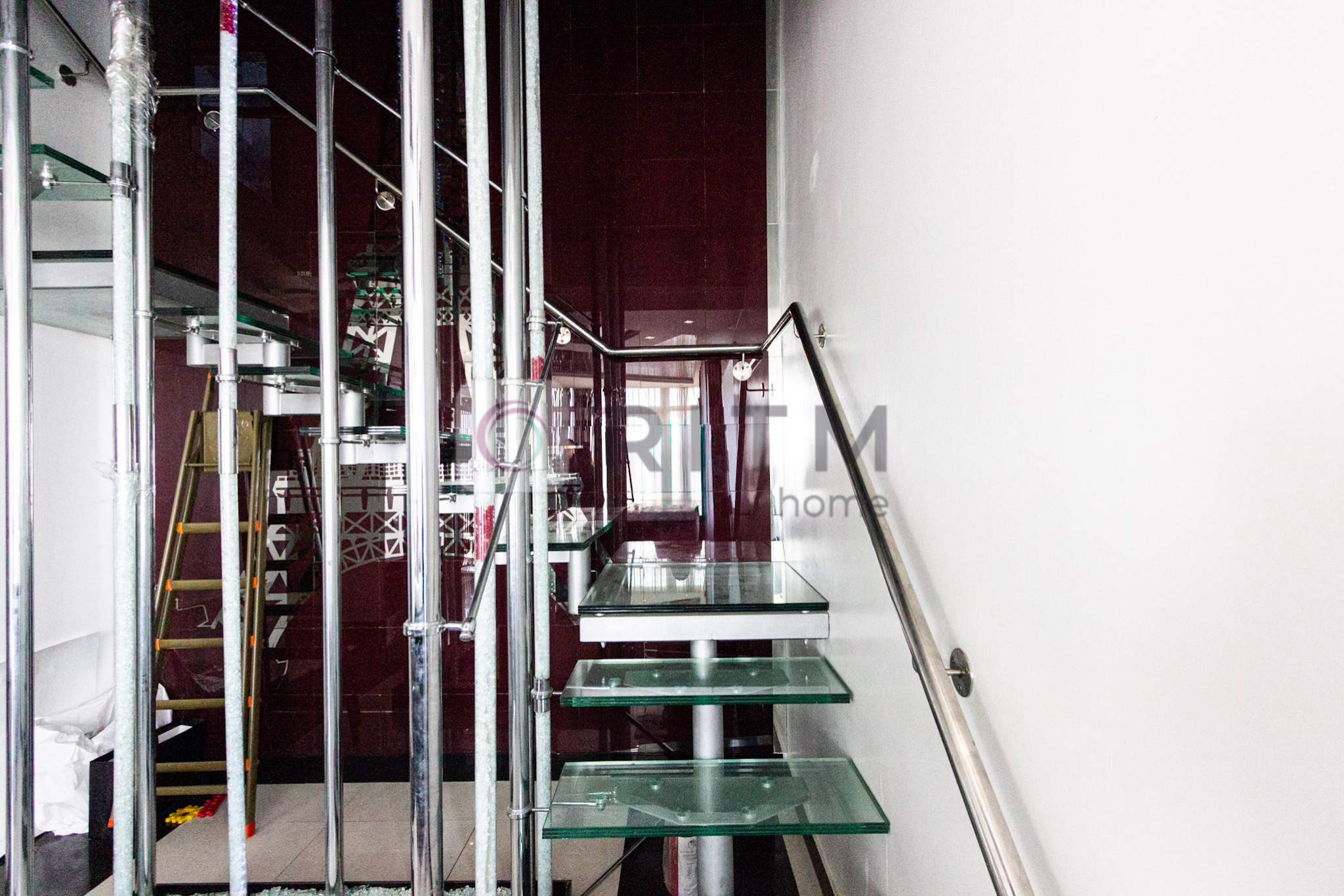 Квартира має багаторівневу структуру зі скляними сходами та цікавими архітектурними рішеннями.