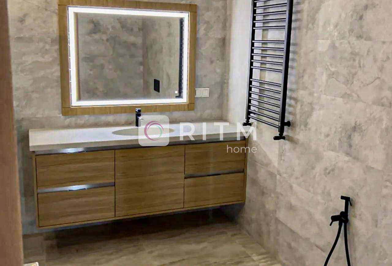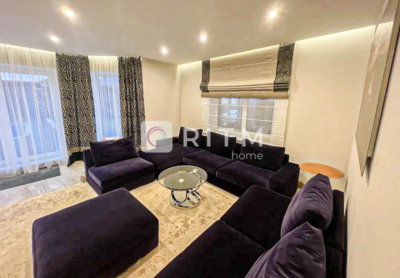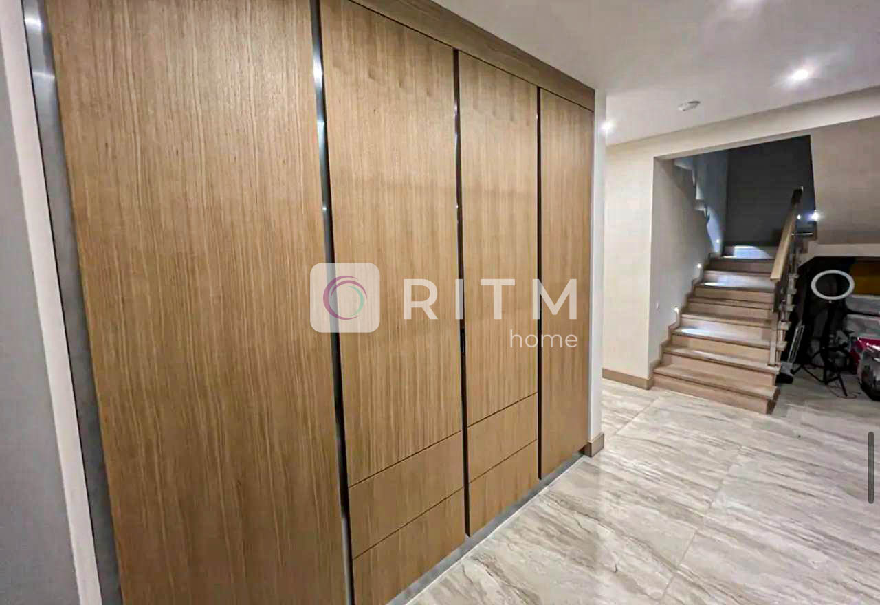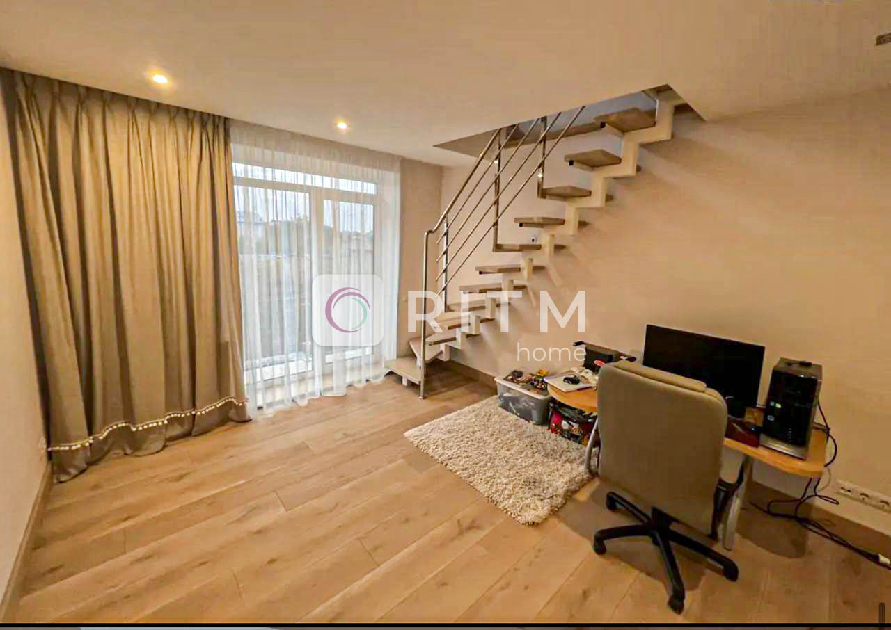3 спальні, 2 дворівневі дитячі кімнати з окремими входами, 3 санвузли. Вітальня з каміном і домашнім кінотеатром, простора кухня 18 м² з вбудованою технікою.